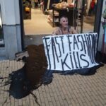 That action marked the beginning of Just Stop Fast Fashion (JSFF). What followed were protests across the country. Not only at the biggest polluters and human rights violators like Primark and Inditex, but also at Dutch companies like The Sting and Bestseller, whose wares contribute as much to the extinction of all life on earth. In addition to the “oil” actions, JSFF also started to use chalk spray and graffiti on sidewalks and windows in shopping streets to point out how much fast fashion ruins the streetscape.