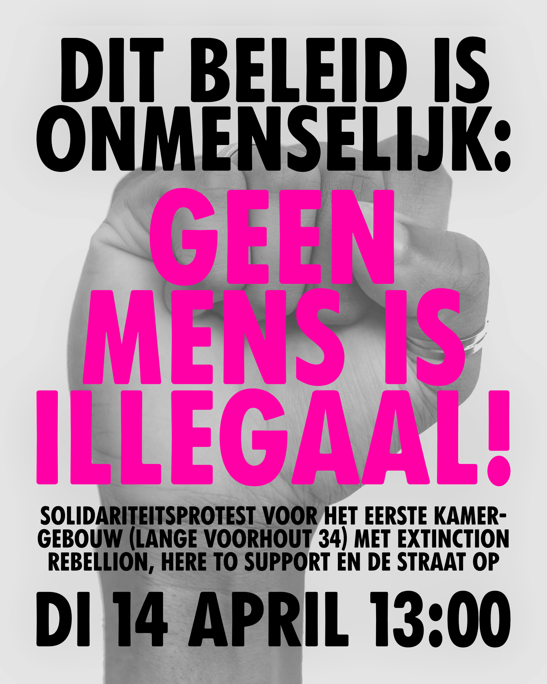 Op dinsdag 14 april 2026 vanaf 13.00 uur organiseren Extinction Rebellion, Here to Support en De Straat Op een solidariteitsprotest voor het gebouw van de Eerste Kamer. Geschokte demonstranten spreken die dag hun afschuw uit in solidariteit met iedereen die in Nederland is omdat die heeft moeten vluchten. De demonstranten hebben protestborden bij zich met teksten als ‘Dit beleid is onmenselijk: Geen mens is illegaal’.