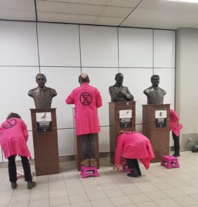 Op 20 maart 13:00 uur veranderden 4 rebellen van Extinction Rebellion de eregalerij voor luchtvaartpioniers [1] in aankomsthal 2 op Schiphol, in een monument voor de veelvliegers van de natuur. De namen werden vervangen door die van vliegende, niet-menselijke dieren. Deze veelvliegers zijn de enigen die kunnen veelvliegen zonder roofbouw te plegen op de natuur. Vaak zijn ze slachtoffer van de klimaat- en ecologische crisis. De borstbeelden zelf werden overgoten met fuchsia verf.*