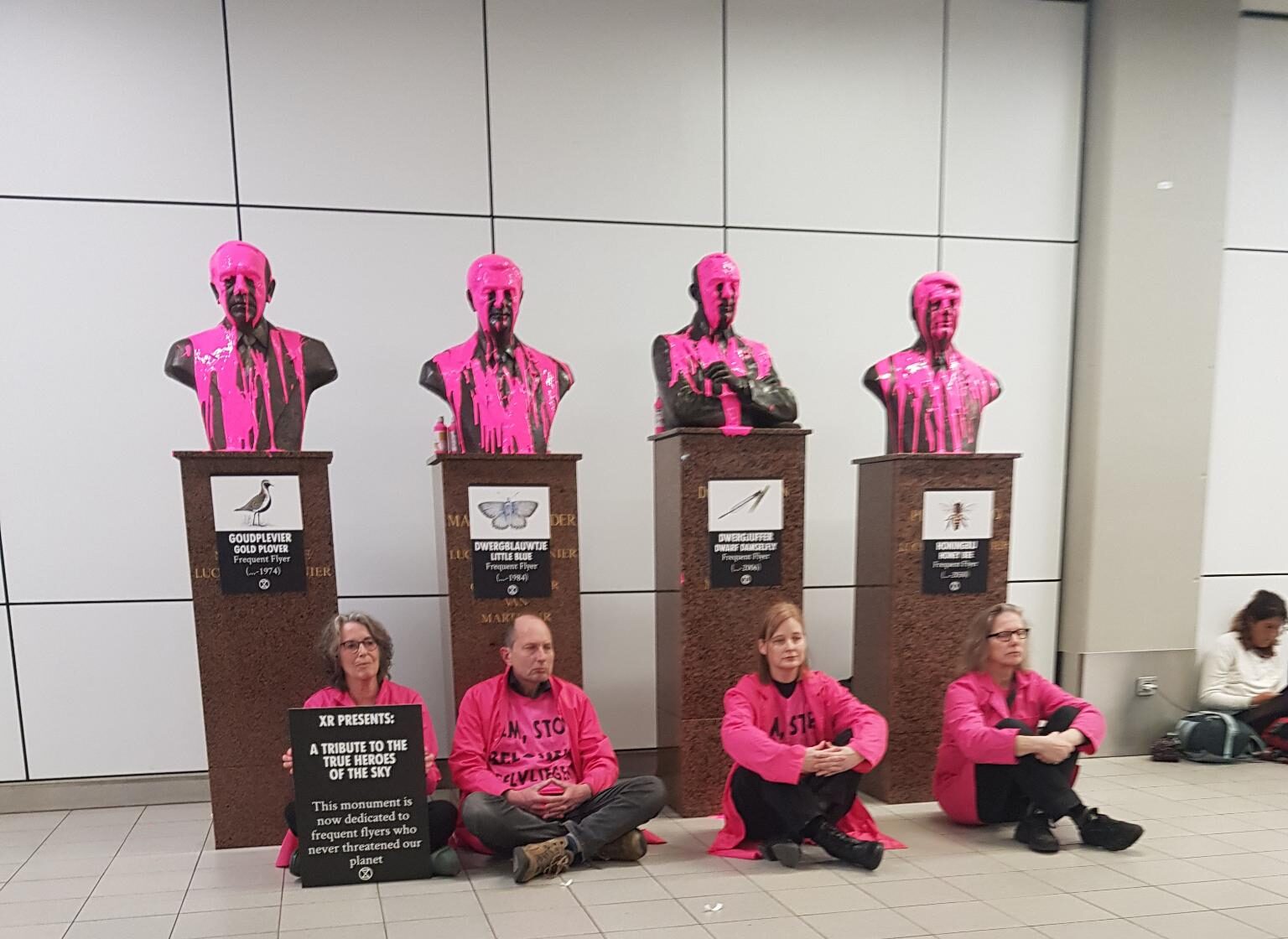 Op 20 maart 13:00 uur veranderden 4 rebellen van Extinction Rebellion de eregalerij voor luchtvaartpioniers [1] in aankomsthal 2 op Schiphol, in een monument voor de veelvliegers van de natuur. De namen werden vervangen door die van vliegende, niet-menselijke dieren. Deze veelvliegers zijn de enigen die kunnen veelvliegen zonder roofbouw te plegen op de natuur. Vaak zijn ze slachtoffer van de klimaat- en ecologische crisis. De borstbeelden zelf werden overgoten met fuchsia verf.*