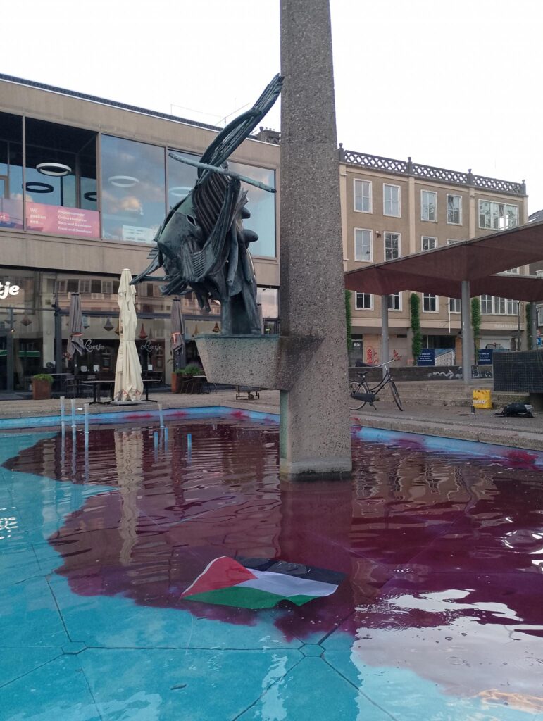 XR Justice Now! kleurt fonteinen bloedrood: Nederland heeft bloed aan zijn handen
