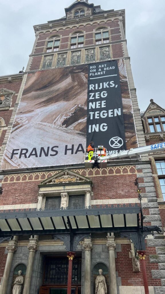 Extinction Rebellion hangt spandoek op gevel Rijksmuseum