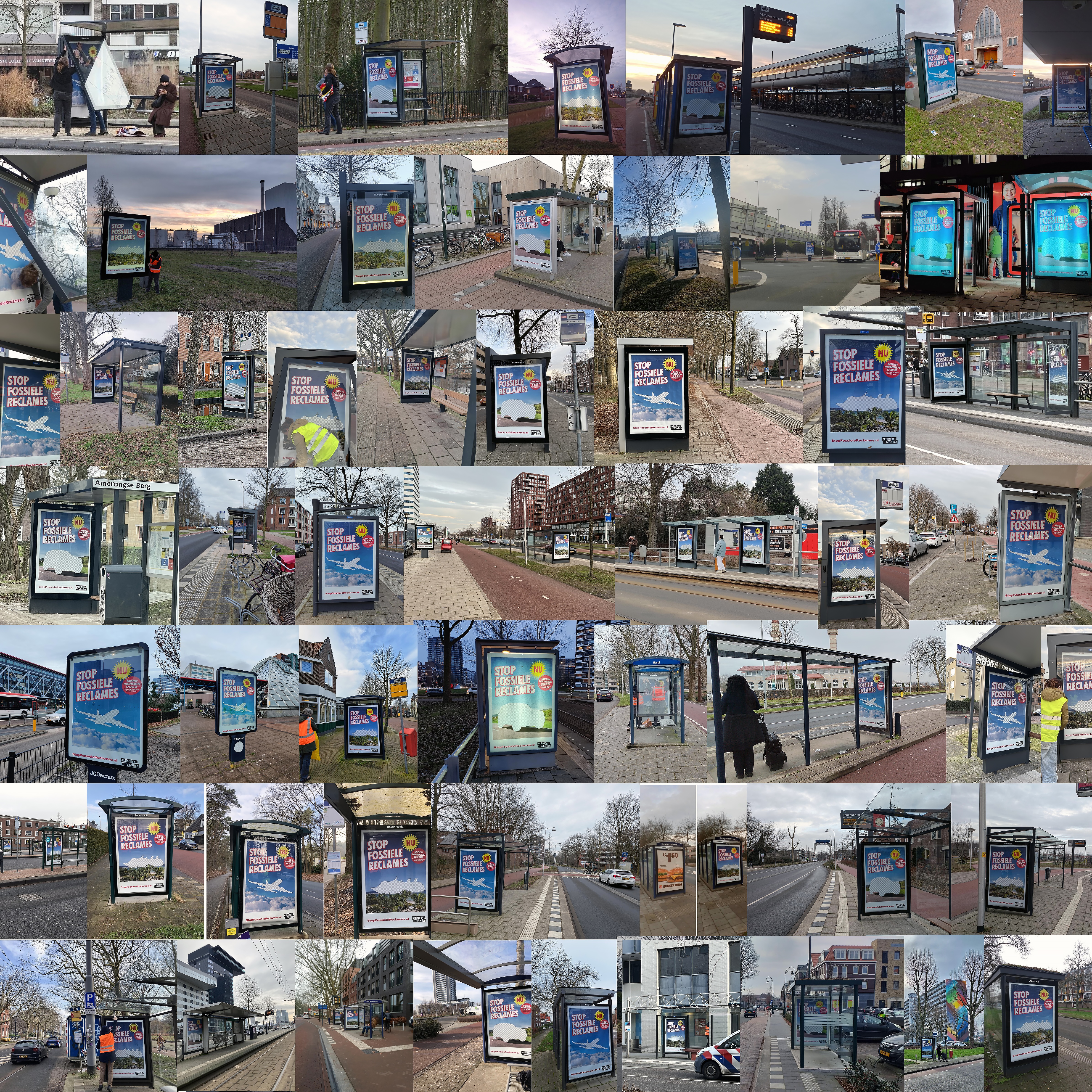 Gistermiddag en -avond hebben rebellen van Extinction Rebellion (XR) door heel Nederland meer dan 700 abriposters met fossiele reclames vervangen door drie kleurrijke XR-posters met de tekst “STOP FOSSIELE RECLAMES”. Hiermee herovert XR de publieke ruimte op de dodelijke fossiele industrie en veegt XR bushokjes, metrohaltes, straten en pleinen schoon van schadelijke fossiele reclames.